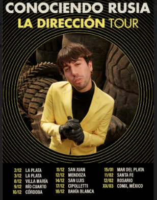 CONOCIENDO RUSIA anuncia el Tour de presentación de su próximo álbum “LA DIRECCIÓN” que estará disponible en todas las plataformas digitales a partir del 12 de noviembre. Conociendo Rusia se presentará en el Teatro Gran Rex los días 23, 24, 25 y 28 de noviembre con aforo completo y terminadas sus cuatro presentaciones en el mítico escenario de la calle Corrientes, el proyecto liderado por Mateo Sujatovich, dará inicio a la gira nacional e internacional “La Direccion Tour”, donde presentará su nuevo álbum “LA DIRECCIÓN” a lanzarse el próximo 12 de noviembre. A partir del mes de diciembre CONOCIENDO RUSIA recorrerá Argentina, México, Uruguay, Chile, España y algunos otros países de Latinoamérica. En marzo de 2022 se presentará en el Vive Latino junto a artistas como C. Tangana, Gary Clarck Jr, Los Fabulosos Cadillacs, Pixies y Residente, entre otros. CONOCÉ LAS CIUDADES YA ANUNCIADAS DE “LA DIRECCIÓN TOUR” 02 y 03/12 La Plata 08/12 Villa María 09/12 Río Cuarto 10/12 Córdoba 11/12 San Juan 12/12 Mendoza 14/12 San Luis 17/12 Cipolletti 18/12 Bahía Blanca 15/01 Mar del Plata 11/02 Santa Fé 12/02 Rosario Marzo México Abril Uruguay Julio España |