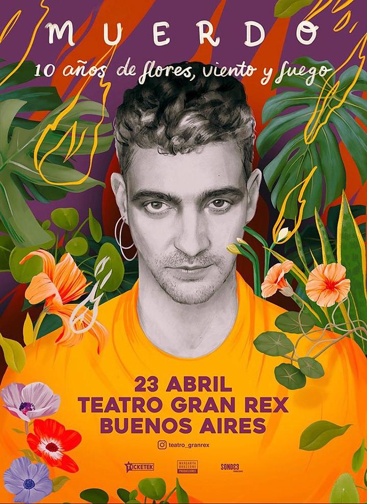 Uno de los músicos más revolucionarios de estos últimos tiempos presenta su gira “10 años de Flores, Viento y Fuego”. Es sin lugar a dudas la gira más importante de MUERDO, tanto en lo personal como en lo profesional, ya que estará festejando 10 años de trayectoria con una gira que lo llevará en este 2022 por todos los rincones de los que el artista guarda un pedazo en su corazón. De esta forma Muerdo no quiso dejar de invitar a quienes siente que son parte fundamental de su show, entre los invitados estará El Bahiano, Connie isla, Sofia Viola y Rochi Igarzabal. Dará apertura al show Florean, quien lanzó a fines del año pasado su disco debut, ¨x Amor¨, La producción artística del disco de Florean estuvo a cargo de Mariano Otero y cuenta con detalles sonoros como la combinación de bases electrónicas con instrumentación orgánica a cargo de músicos destacados de la escena local. Luego de llenar el varios estadios como el Lunario en Mexico, participar de Colombia al parque llega a La Argentina y las fechas son: 22 de abril en Vorterix club de Mar del Plata 23 de abril en el Teatro Gran Rex de Buenos Aires 29 de abril en Sala Lavardén de Rosario 30 de abril en Quality Espacio de Córdoba |