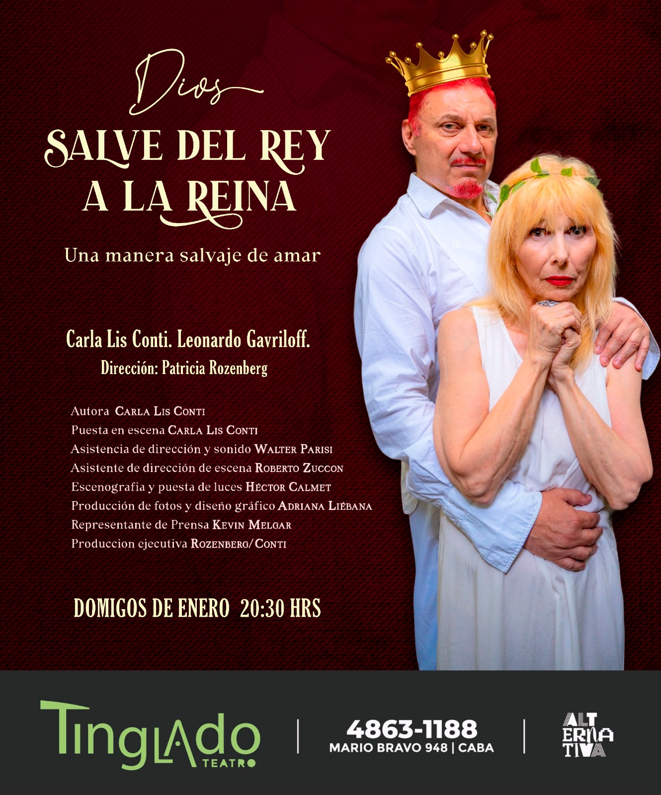 Autora: Carla Lis Conti Elenco: Carla Lis Conti, Leonardo Gavriloff Puesta en escena: Carla Lis Conti Asistente de dirección y sonido: Walter Parisi Asistente de dirección de escena: Roberto Zuccon Escenografia y puesta de luces: Héctor Calmet Producción de fotos y diseño gráfico: Adriana Liebana Prensa: Kevin Melgar (0KM Prensa) Producción ejecutiva: Rozenberg / Conti