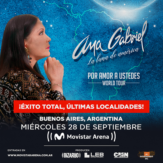 ANA GABRIEL EN ARGENTINA! “POR AMOR A USTEDES – WORLD TOUR” ÚLTIMOS TICKETS!! 28 DE SEPTIEMBRE MOVISTAR ARENA La “Luna de América” regresa a Buenos Aires para presentar su “Por Amor a Ustedes – World Tour”, gira que la llevará por gran parte de Latinoamérica y que tendrá su noche de romanticismo el miércoles 28 de septiembre en Movistar Arena, una noche que se espera, sea inolvidable. |