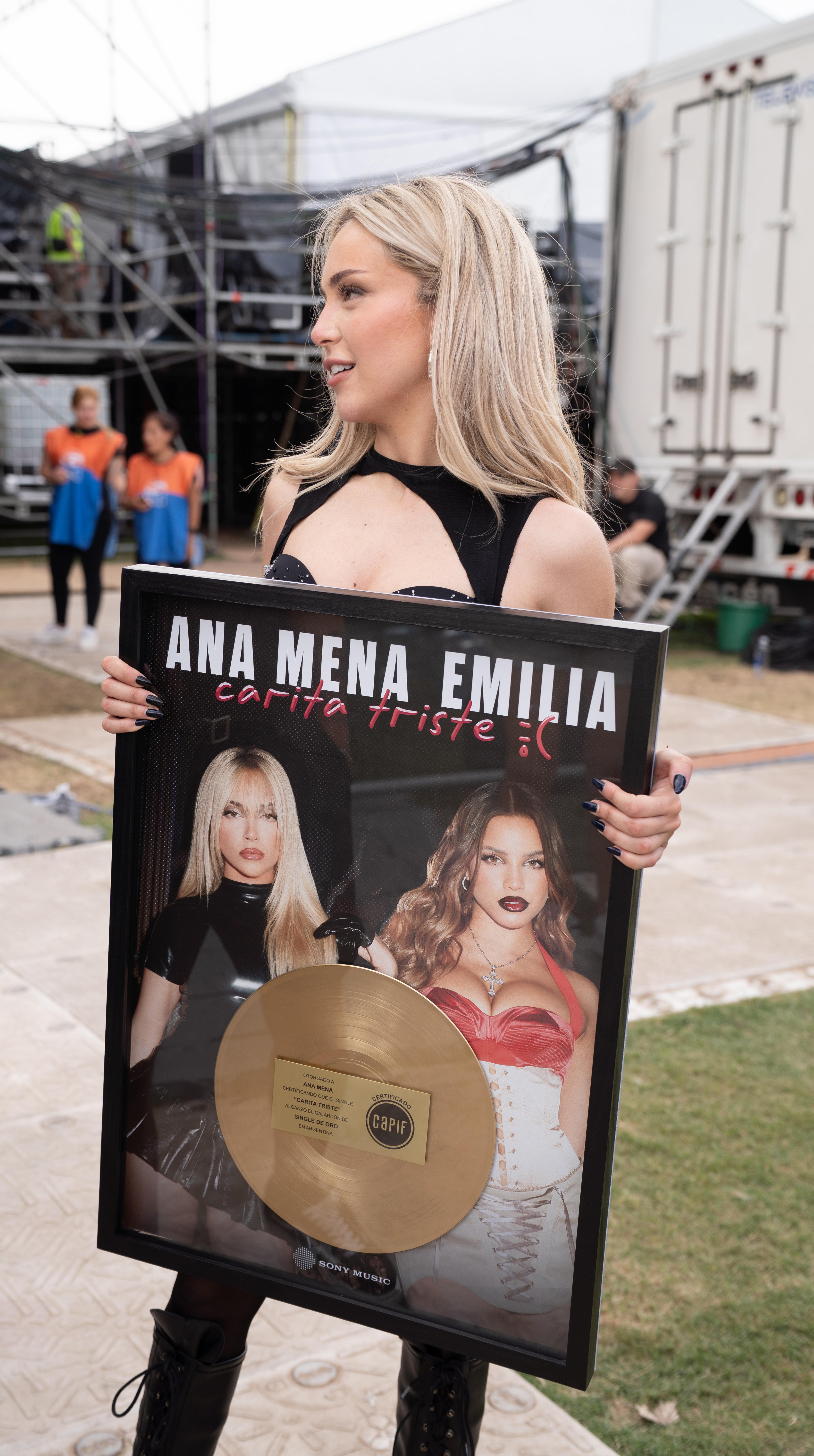 La reconocida artista española Ana Mena ha sido galardonada con un Disco de Oro por su exitosa colaboración "Carita Triste", junto a la talentosa Emilia Mernes. Este prestigioso reconocimiento, otorgado por la Cámara Argentina de Productores de Fonogramas y Videogramas (CAPIF), se presentó tras la destacada actuación de Mena en el escenario principal de Lollapalooza. Este logro representa un hito significativo en la carrera de la artista malagueña, ya que es la primera certificación discográfica que recibe fuera de Europa. En el continente europeo, Ana Mena ha acumulado más de 60 Discos de Platino y Oro en países como España, Italia, Francia y Suiza. "Carita Triste" ha alcanzado más de 80 millones de reproducciones en plataformas digitales, incluyendo YouTube y Spotify, y ha sido reconocida como Doble Disco de Platino en España. El reconocimiento fue entregado por representantes de Sony Music, entre ellos Damian Amato, Presidente de South America; Agustin Sarrichio, Director de Marketing para el Cono Sur; y Anibal Moreno, Director Digital para el Cono Sur, junto a Eduardo Basagaña de EB Producciones, como parte del equipo de Ana Mena. Este galardón subraya el creciente impacto de Ana Mena en la industria musical a nivel internacional y reafirma su posición como una de las artistas más destacadas de la escena pop latina. Ana Mena fue sin dudas una de las grandes protagonistas de la última edición de Lollapalooza con una actuación descollante en el Escenario Principal, donde su interpretación memorable de "Cae el Sol" de Airbag, la convirtió en Tendencia -Trending Topic- en todas las redes sociales, consolidando su romance absoluto con el público argentino; y prometiendo, luego su Sold Out en Niceto Club, volver pronto a nuestro país para presentarse en un escenario más grande. |