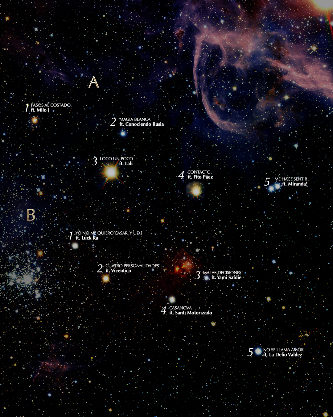 TRACKLIST 1. "Pasos al costado" junto a Milo J - Producida por Nico Cotton 2. "Magia blanca" junto a Conociendo Rusia - Producida por Mariano Otero 3. "Loco un poco" junto a Lali - Producida por Ale Sergi 4. "Contacto" junto a Fito Páez - Producida por Mariano Otero 5. "Me haces sentir" junto a Miranda! - Producida por Ale Sergi 6. "Yo no me quiero casar, y ud?" junto a Luck Ra - Producida por Renzo Luca 7. "Cuatro Personalidades" junto a Vicentico - Producida por Ezequiel Araujo 8. "Malas decisiones" junto a Yami Safdie - Producida por Renzo Luca 9. "Casanova" junto a Santi Motorizado - Producida por Álvaro Villagra y Turf 10. "No se llama amor" junto a La Delio Valdez - Producida por Nicolas Repetto y La Delio Valdez |
