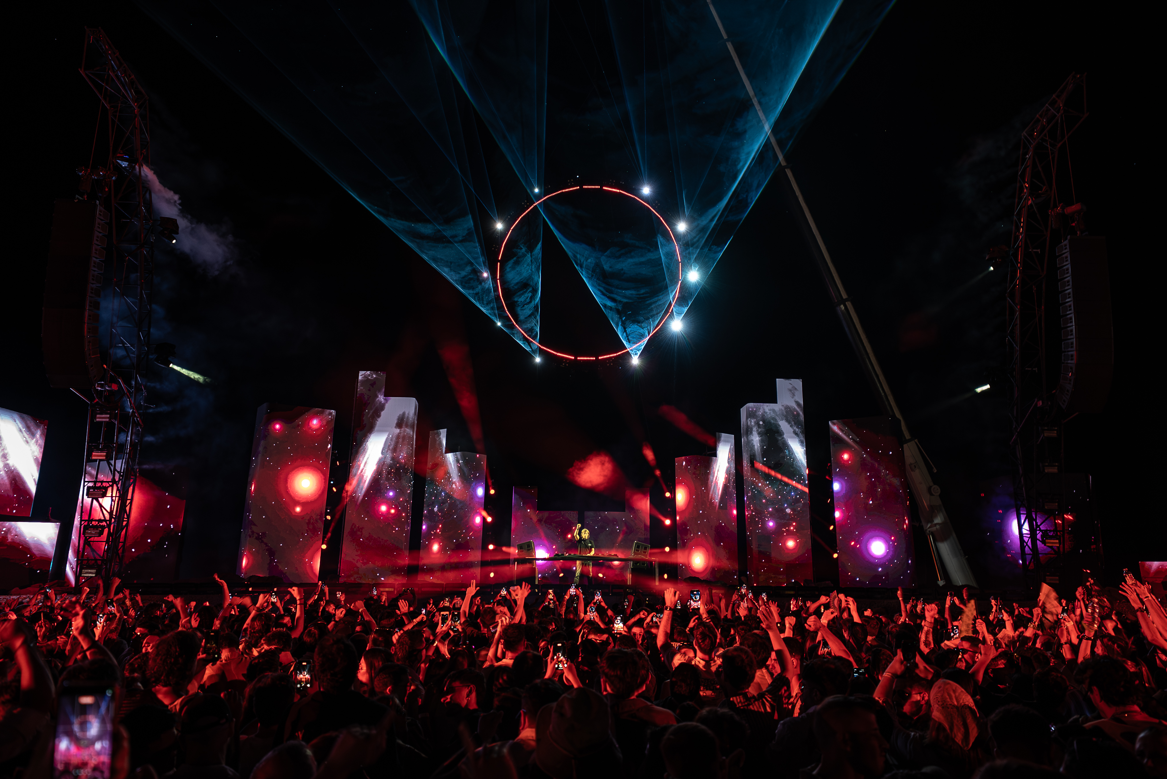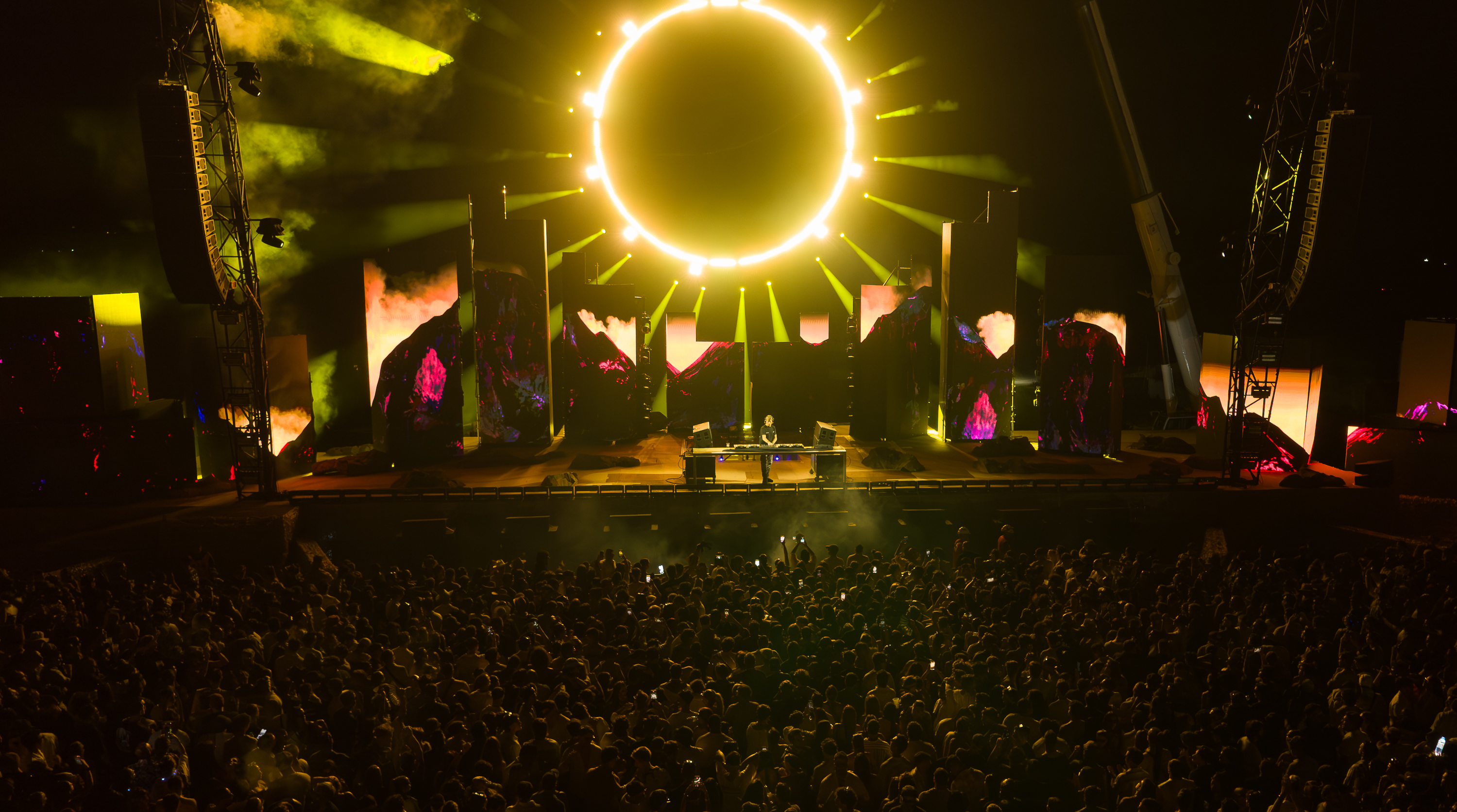 Minutos más tarde llegó el segundo punto de quiebre. Dos grúas emergieron detrás del escenario sosteniendo un aro de luz móvil de más de 12 metros de diámetro, suspendido a 45 metros de altura. Este factor sorpresa dio identidad propia a cada noche: su performance fue diseñada especialmente para cada show, con movimientos no sólo verticales, sino también traslaciones en múltiples ejes.