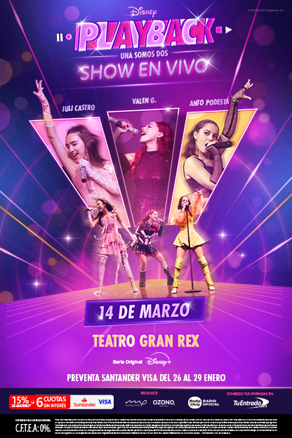El show en vivo de la serie musical juvenil Playback: Una somos dos protagonizada por Juli Castro, Antonella Podestá y VALEN G desembarca el 14 de marzo en el teatro Gran Rex con un espectáculo lleno de música y baile. Las entradas ya están disponibles desde hoy en preventa exclusiva aquí y hasta el 29 de enero con un 15% de ahorro y en 6 cuotas sin interés para clientes con Tarjetas Santander Visa. La venta general se habilitará el 29 de enero a las 16:01 hs. aquí y en la boletería del teatro Gran Rex. Los clientes con Tarjetas Santander Visa podrán adquirir sus entradas en 6 cuotas sin interés. En el show en vivo de Playback: Una somos dos; Gluzz, el certamen de talentos que conquistó a toda Latinoamérica, presenta un nuevo concurso internacional donde el talento individual no alcanza y el verdadero desafío es trabajar en equipo. Emma (Juli Castro), Cami (Antonella Podestá) y Sasha (Valen G ) enfrentan desafíos inesperados y decisiones que ponen a prueba sus vínculos. El deseo de brillar en solitario amenaza con poner en riesgo el sueño compartido. Entre música, coreografías y emoción, el grupo deberá aprender a dejar de lado su ego para construir una única performance. El espectáculo es una experiencia para toda la familia que celebra la unión y el esfuerzo colectivo. Durante la función se contará con la posibilidad de acceder a kits sensoriales, en caso de necesitar descansar de estímulos visuales y sonoros. El kit contiene audífonos reductores de sonido, anteojos de filtro verde UVI y tarjetas de emociones con pictogramas. Podrá ser solicitado en la boletería del teatro presentando el DNI. El show en vivo de Playback: Una somos dos llega de la mano de Ozono Producciones y MP Producciones , creadores de exitosos espectáculos como La Sirenita, “Matilda” y “School of Rock”. La serie Playback: Una somos dos se encuentra disponible en Disney+ con todos sus episodios. |