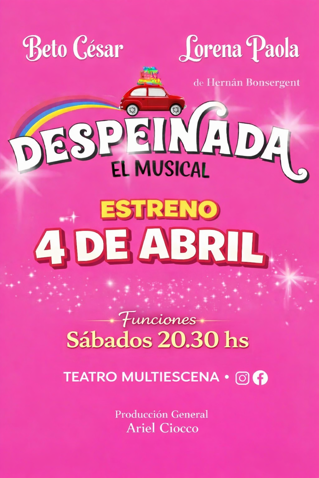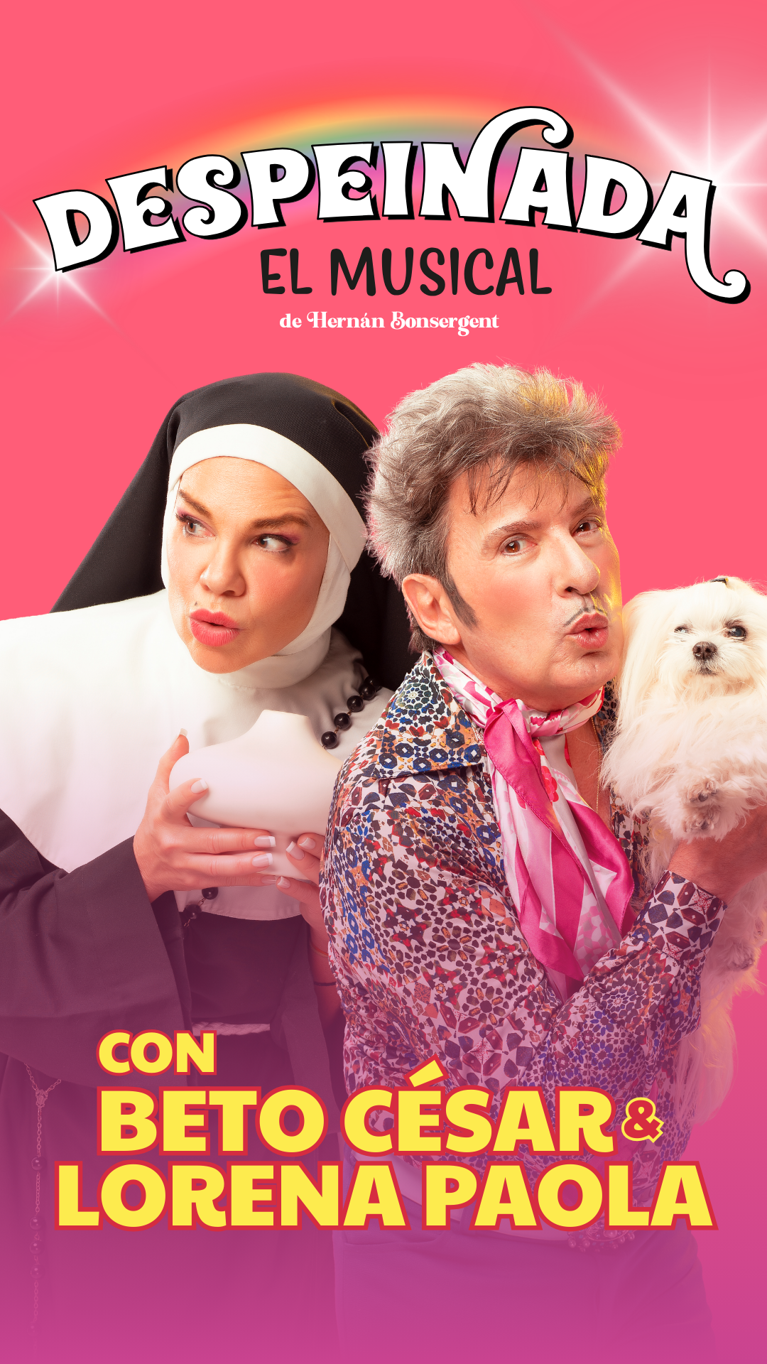 Con un elenco encabezado por Lorena Paola y Beto César, 20 artistas en escena harán que el público no pare de bailar, cantar, reír y disfrutar de este musical alocado, junto a las canciones de Palito Ortega, Violeta Rivas, Juan y Juan, Donald, Sandro y muchos más.