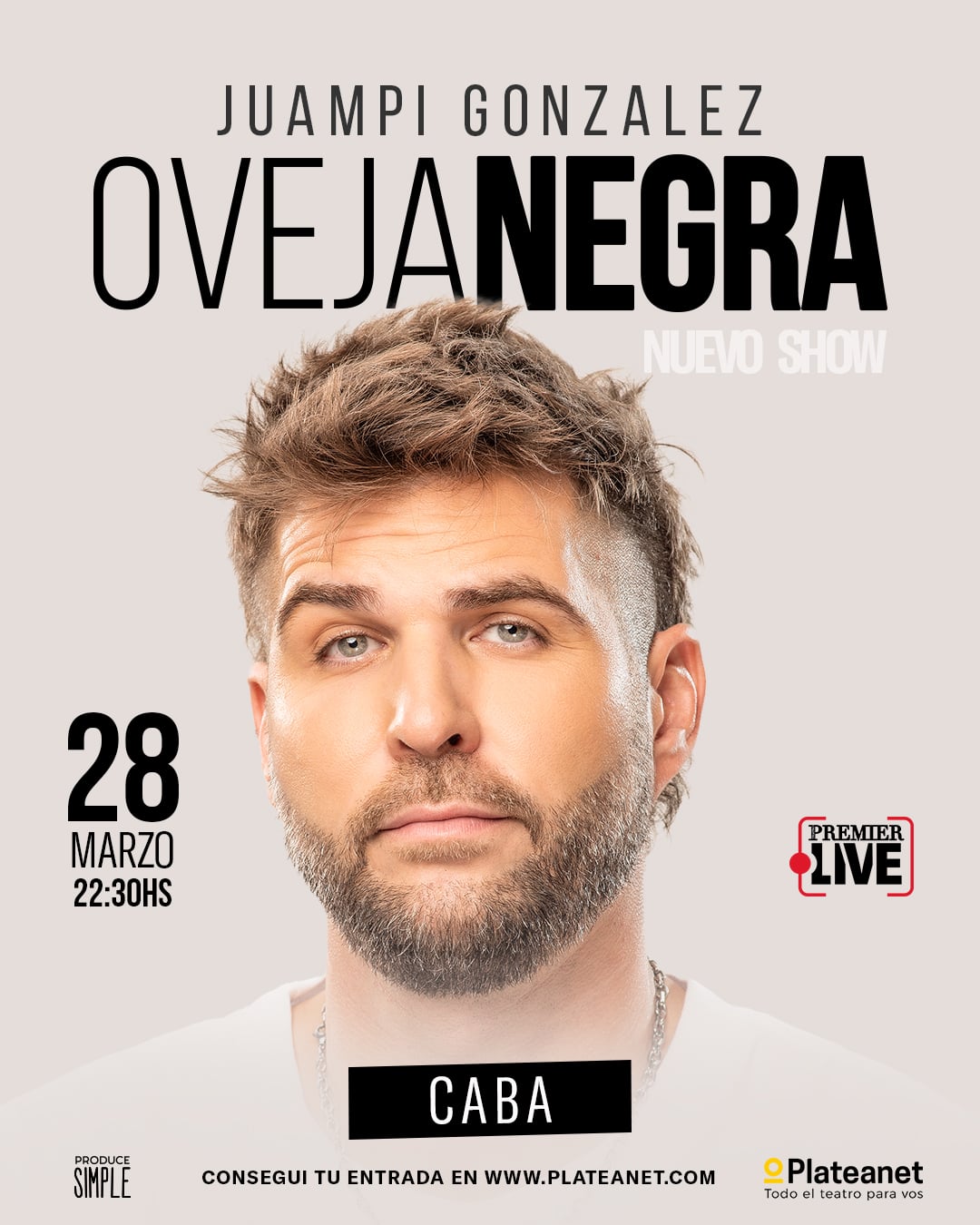 Juampi González estrena OVEJA NEGRA, su cuarto unipersonal, un show donde explora su identidad, sus contradicciones y el vértigo de acercarse a los 40 sin haber cumplido ninguno de los “casilleros” que supuestamente había que cumplir. La función será el sábado 28 de marzo a las 22:30hs en el Teatro Premier (Av. Corrientes 1565, CABA). Las entradas se pueden adquirir por la web www.juampigon.com, por Plateanet o en la boletería del teatro. Con humor filoso y una mirada tan honesta como incómoda, Juampi se para frente al público para hablar de ese momento extraño en el que todos parecen tener un plan… menos uno. Entre risas y confesiones, el comediante pone en palabras las inseguridades, los mandatos sociales y las comparaciones inevitables que atraviesan a toda una generación. OVEJA NEGRA invita a reírse de sentirse raro, distinto o directamente perdido. A cuestionar las expectativas impuestas y a descubrir que, detrás de cada historia personal, hay algo en común. Porque todos, en algún punto, tenemos un poquito de oveja negra. PRODUCE SIMPLE @produce.simple